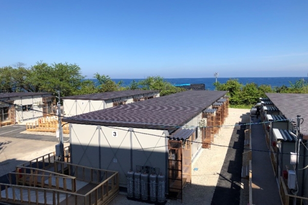 能登学舎周辺の状況(2024年5月20日)能登学舎のグラウンドに応急仮設住宅が建ちました