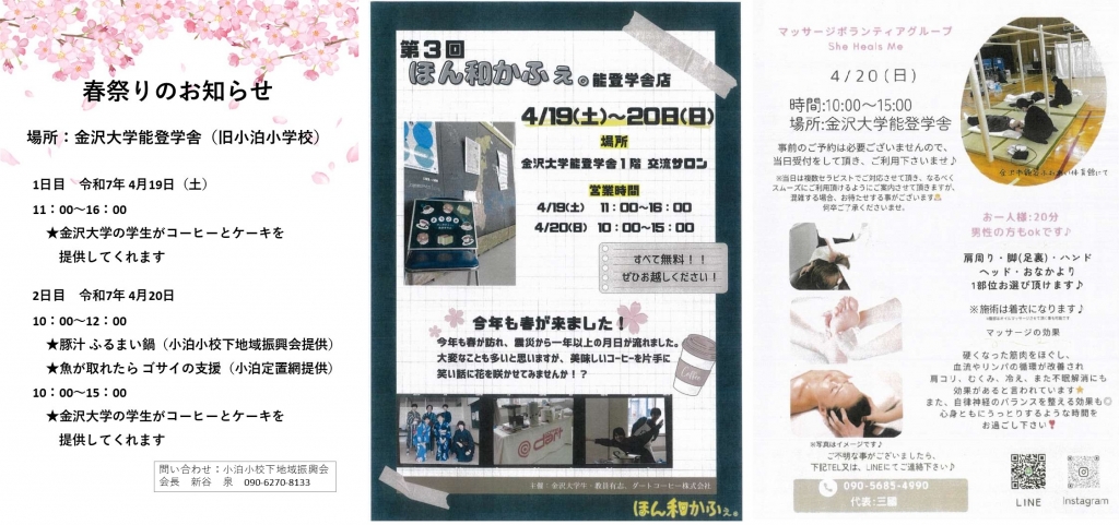 能登学舎のスタッフも、小泊小校下地域振興会の皆さんからと一緒に ふるまい鍋や、お配りするお菓子の用意をさせて頂きます。小泊定置網からは、魚がとれたらお裾分けを頂けるかもしれないそうです。 お花見には時期を過ぎてしまう頃ではありますが 能登学舎にいらして下さるみなさまと楽しい一日を過ごしたいと考えています。